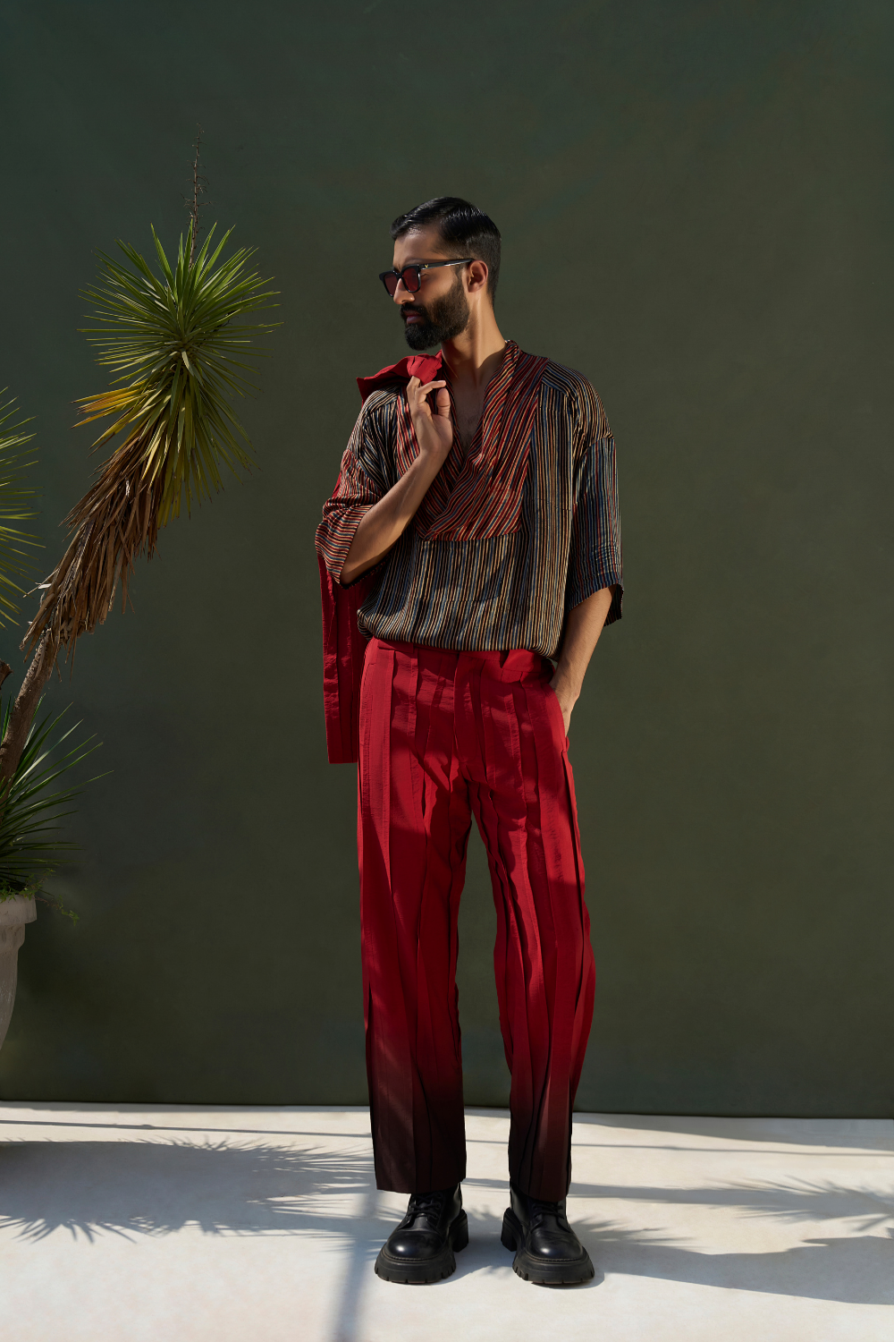 This Ajrakh silk shirt blends traditional craft with a contemporary twist, featuring reimagined Ajrakh stripes in a modern, colorblocked layout. The print is light, dressy, and effortlessly stylish—perfect for both elevated and everyday looks. Crafted from fine silk, it offers an easy drape and a refined feel, balancing heritage with modern elegance