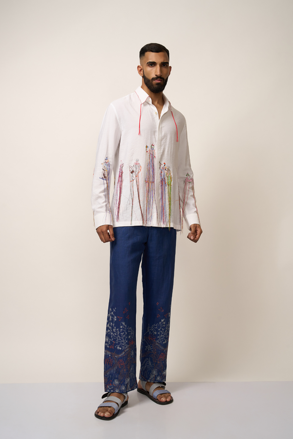 Our bally broads shirt is handcrafted in fine feather viscose and display beautifully embroidered character from Khanijo’s circus – Circ Du Soul. The shirt comes with a concealed placket and a fine cotton lining. The shirt is finished with ethically sourced mother of pearl buttons. Match this shirt with your denims, joggers or chinos to a day affair or take the circus clubbing with you – this one has got your covered every way!
