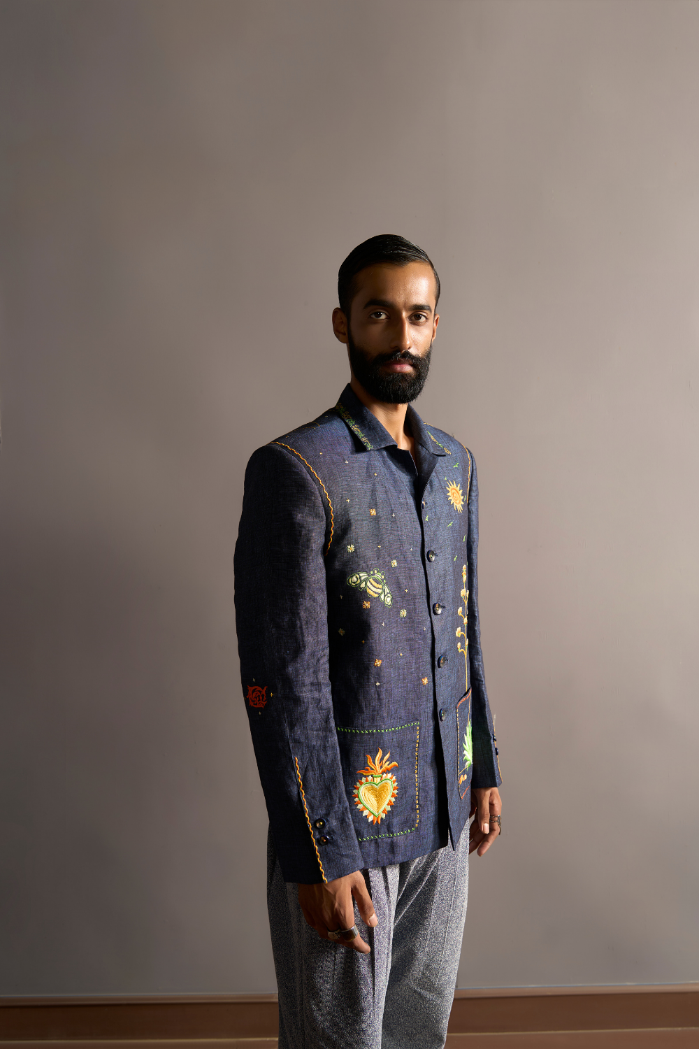 Crafted from premium indigo textured linen, The Bug jacket features intricate hand embroidery that captures the vibrant spirit of agave plantations and desertscapes. Bright bugs and beautiful placements bring life to the design, with vibrant colors standing out against the deep indigo fabric. Lightweight and breathable, it’s a stunning addition to both casual and semi-formal wardrobes.