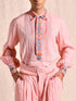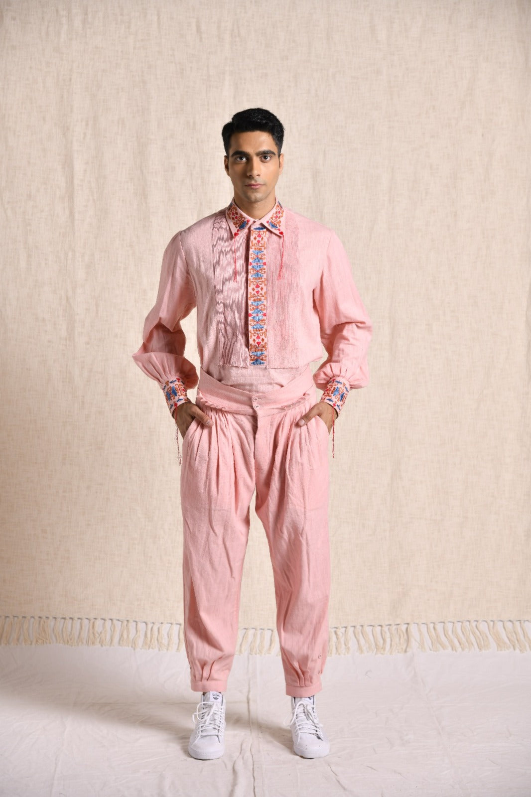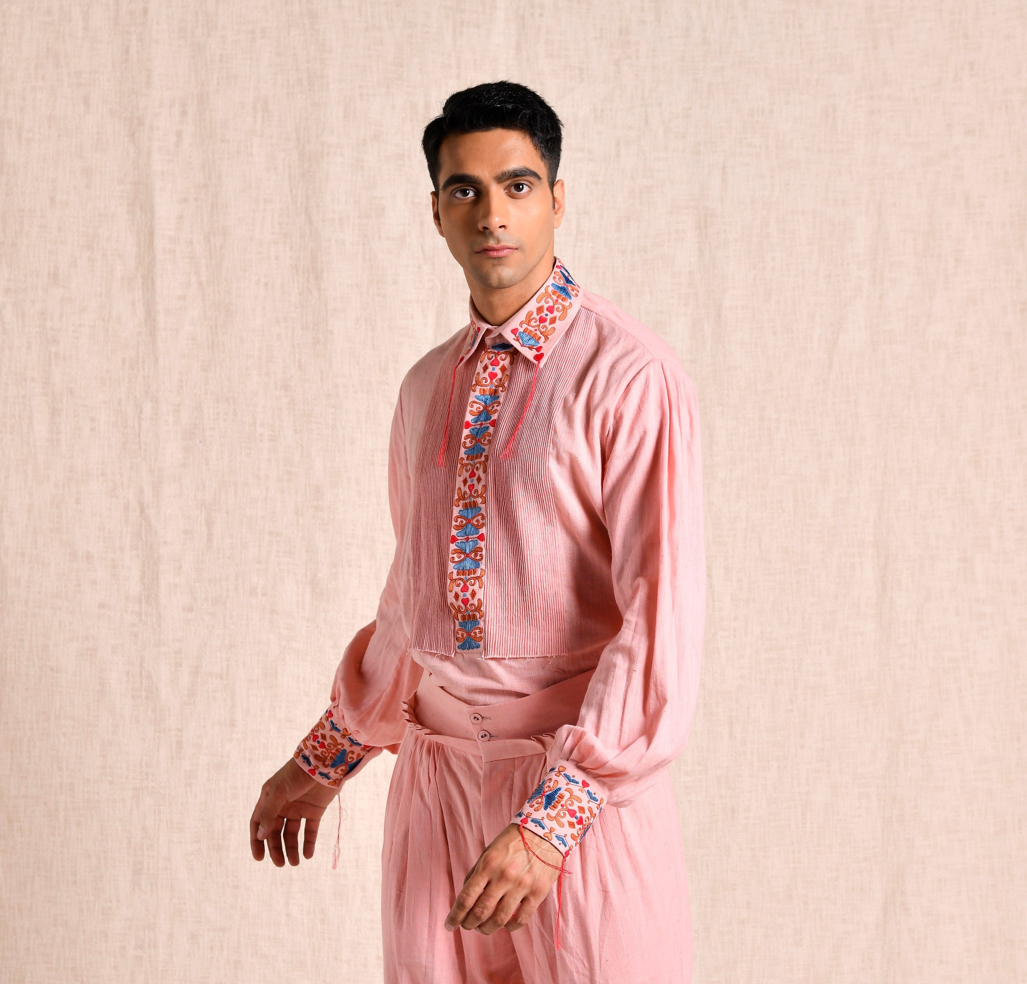 Our carol shirt is handcrafted in naturally dyed khadi and ornamented with exquisite hand embroideries in silk yarns setting a carnival-esque mood around it. The shirt comes with a half placket and hand-embroidered cuffs and collars. Just the right fit for the celebration-on-vacation club, pair this shirt for festive to holiday affairs and go easy!