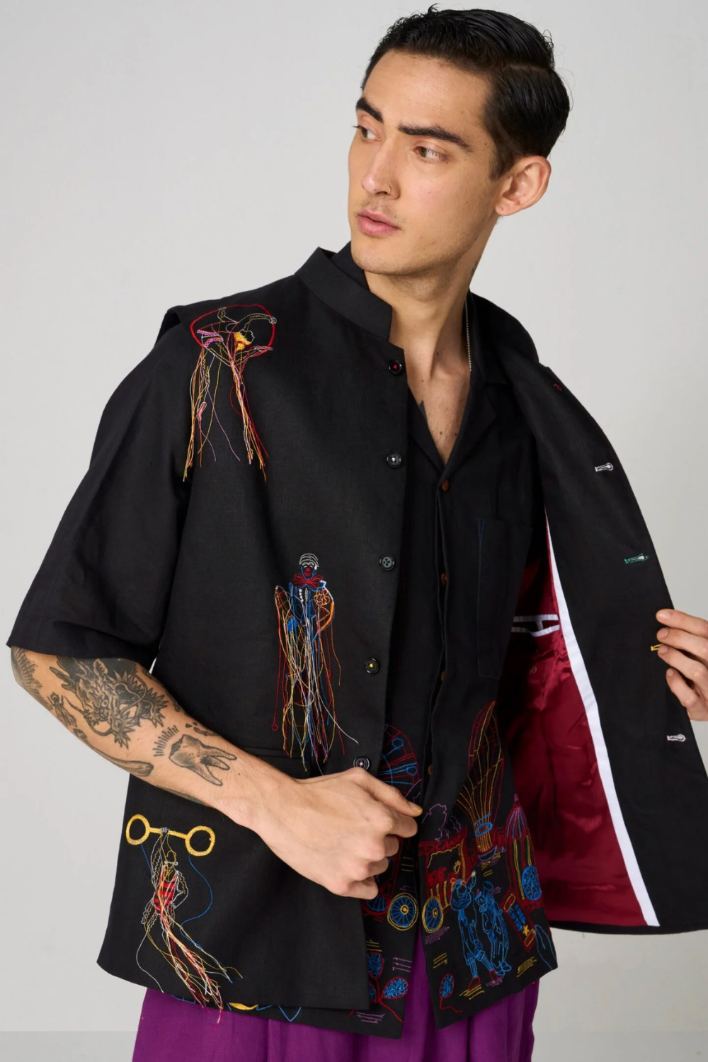 A round neck bandi with shell buttons, embroi dered with clown motifs.