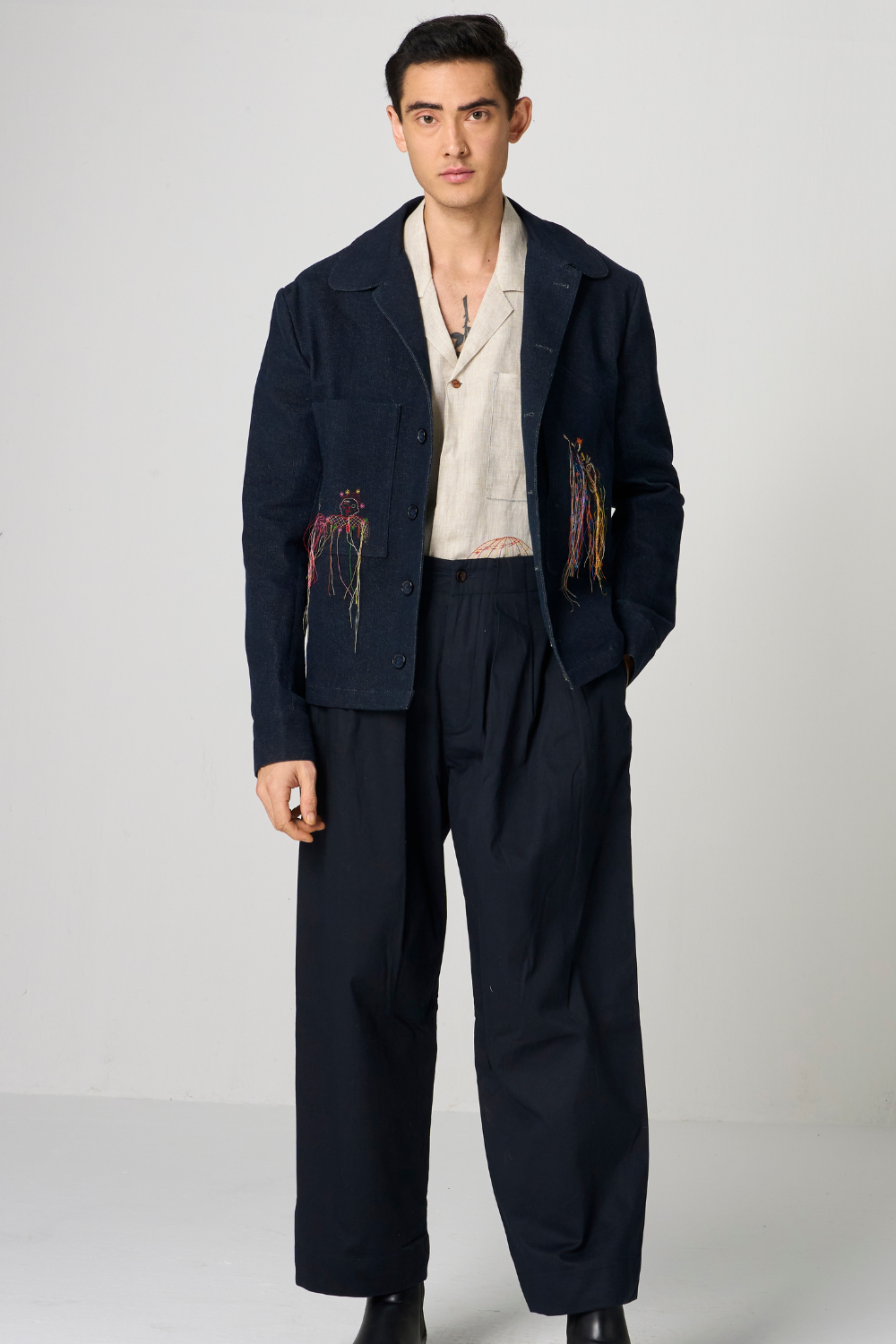 CLOWN JACKET CLW-JKT-01 Dark Navy DENIMThis denim jacket is made in the timeless hue of indigo, each clown embroidered with hanging threads. A relaxed fit ensuring comfort and breathablility