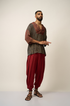 A contemporary take on traditional silhouettes, this madder red dhoti are crafted from viscose that moves effortlessly with the body. Designed with deep pleats that fall gracefully from the waistband to the tapered ankle, they offer a sculptural elegance with a relaxed edge. The lightweight fabric enhances the drape, making them ideal for both transitional weather and layering. Finished with a buttoned waistband and side pockets, these trousers bring comfort, movement, and bold style into perfect balance.