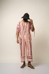 Crafted from meticulously handwoven double ikat cotton, this jumpsuit embodies a quiet boldness. The deep neckline and relaxed tailoring are balanced by structured drapes and thoughtful details—adjustable sleeve ties, subtle side pockets, and a gently cropped hem. Rich stripes in wine, rose, and ivory create a rhythmic flow, paying homage to traditional textile heritage while embracing a contemporary silhouette.