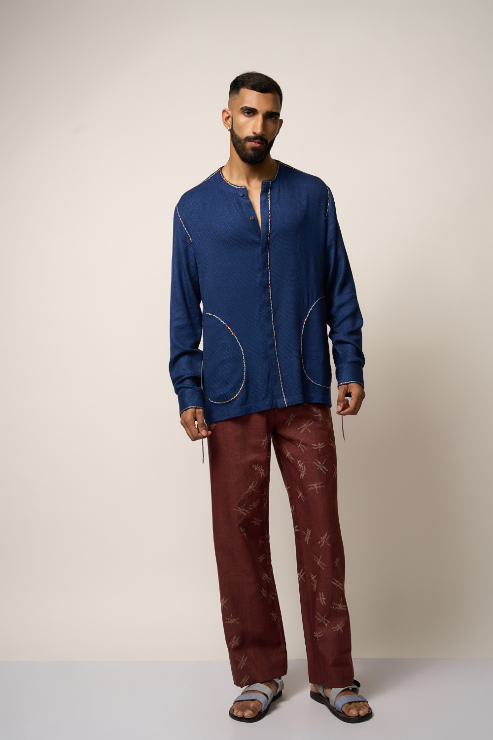 Crafted from breathable linen, these straight-fit trousers feature a charming all-over with machine emb of clustered dragonflies in earthy tones. Ideal for both casual outings and relaxed wear, these trousers pair effortlessly with neutral or bright tones for a striking look.