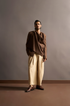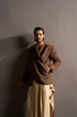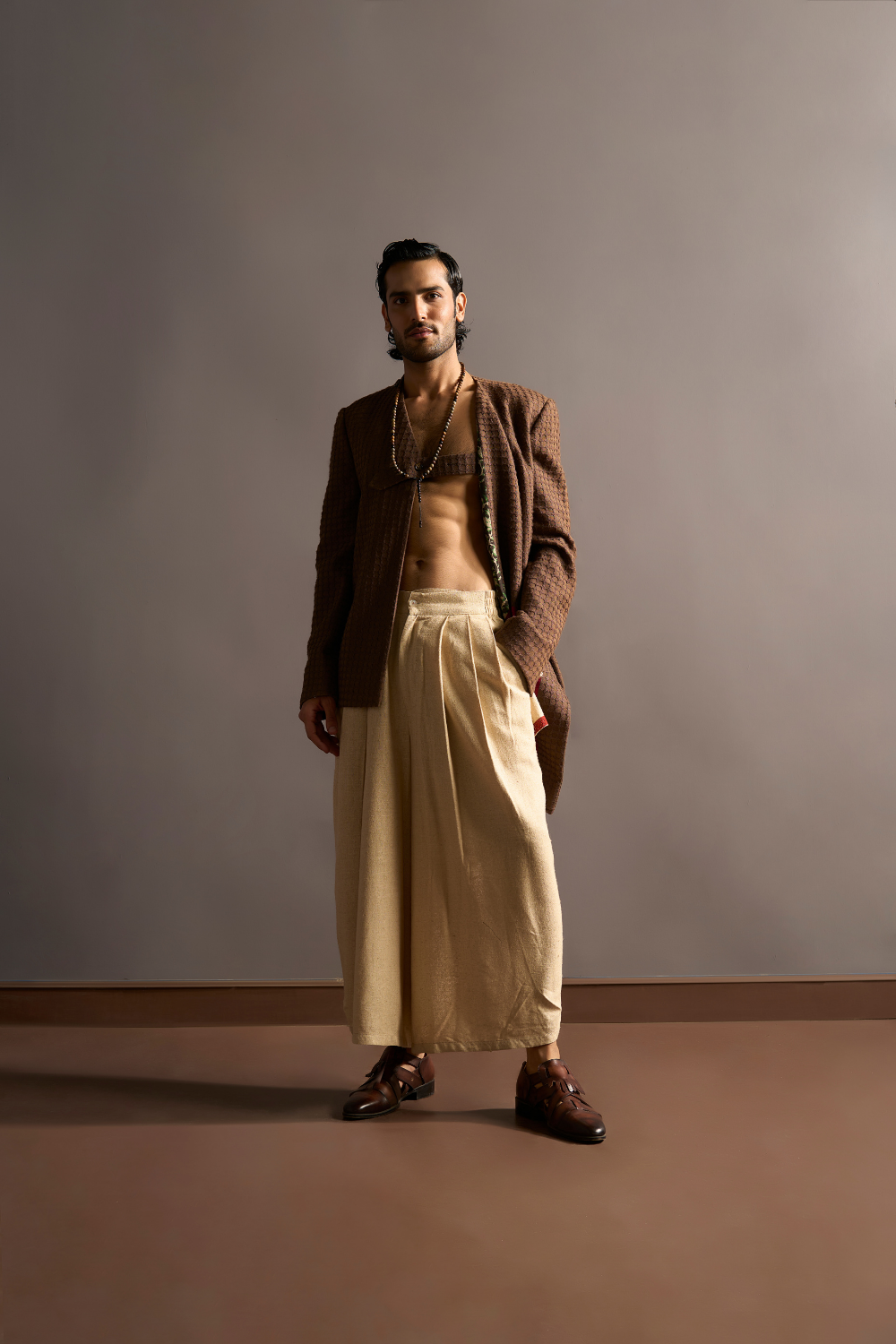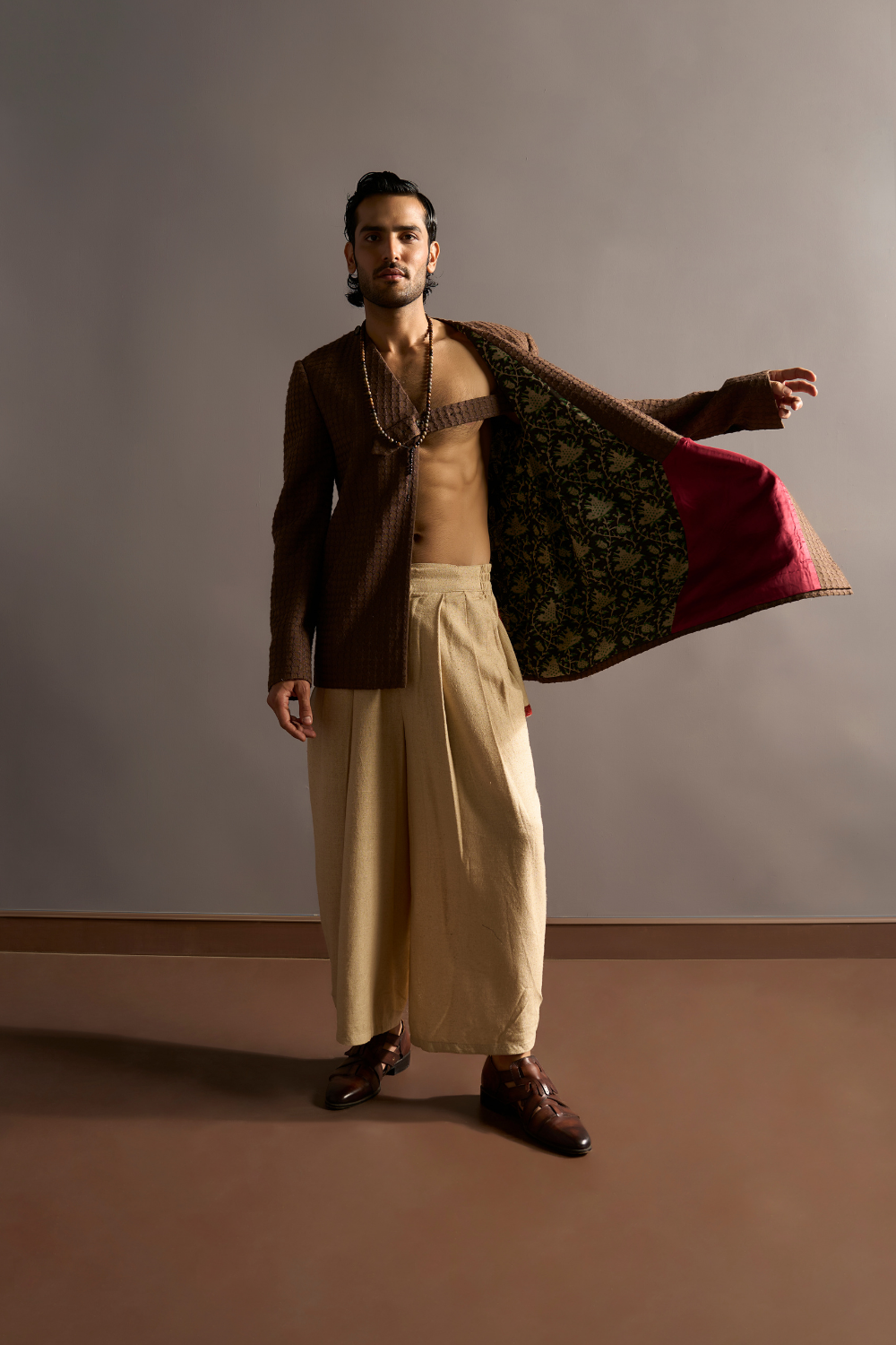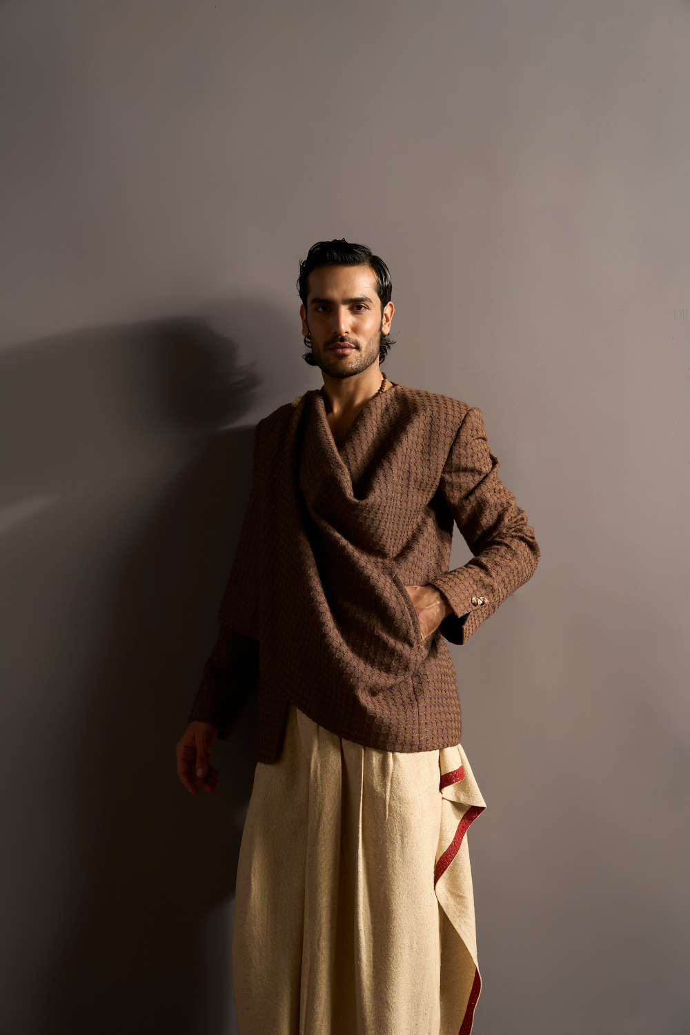 Brown Draped textured jacket crafted from cottonThe unique textured fabric and draped design offer a chic, contemporary silhouette while maintaining comfort and ease. Whether you’re dressing up for a casual outing or looking for something stylish to layer over an ensemble, this versatile jacket adds a modern touch to your wardrobe.