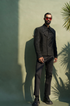 The Relativity jacket in black features black embroidery that creates a striking illusion of depth, adding dimensional perspective and architectural intrigue to the silhouette. This piece is a blend of comfort and style, making it ideal for both formal and semi-formal settings.