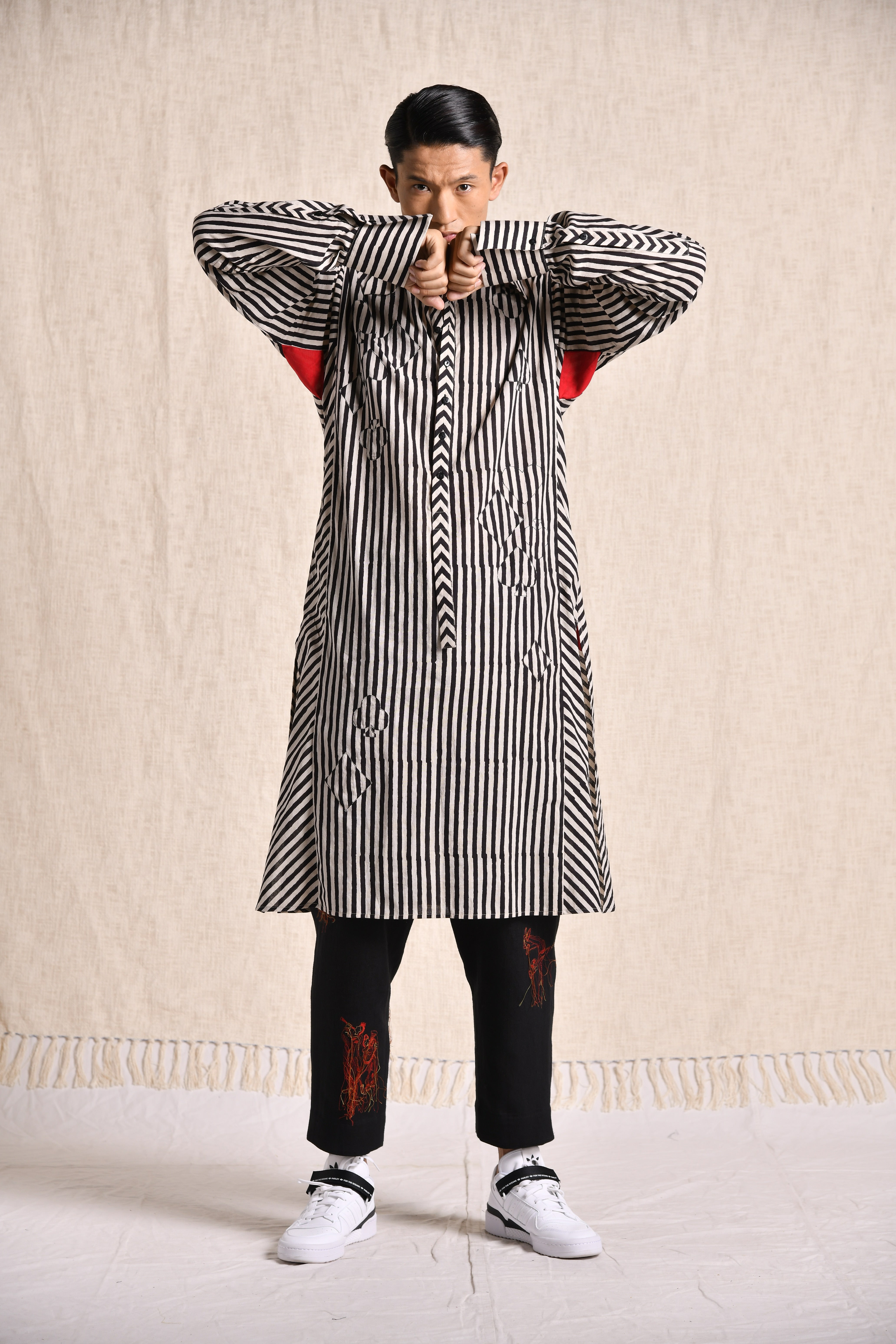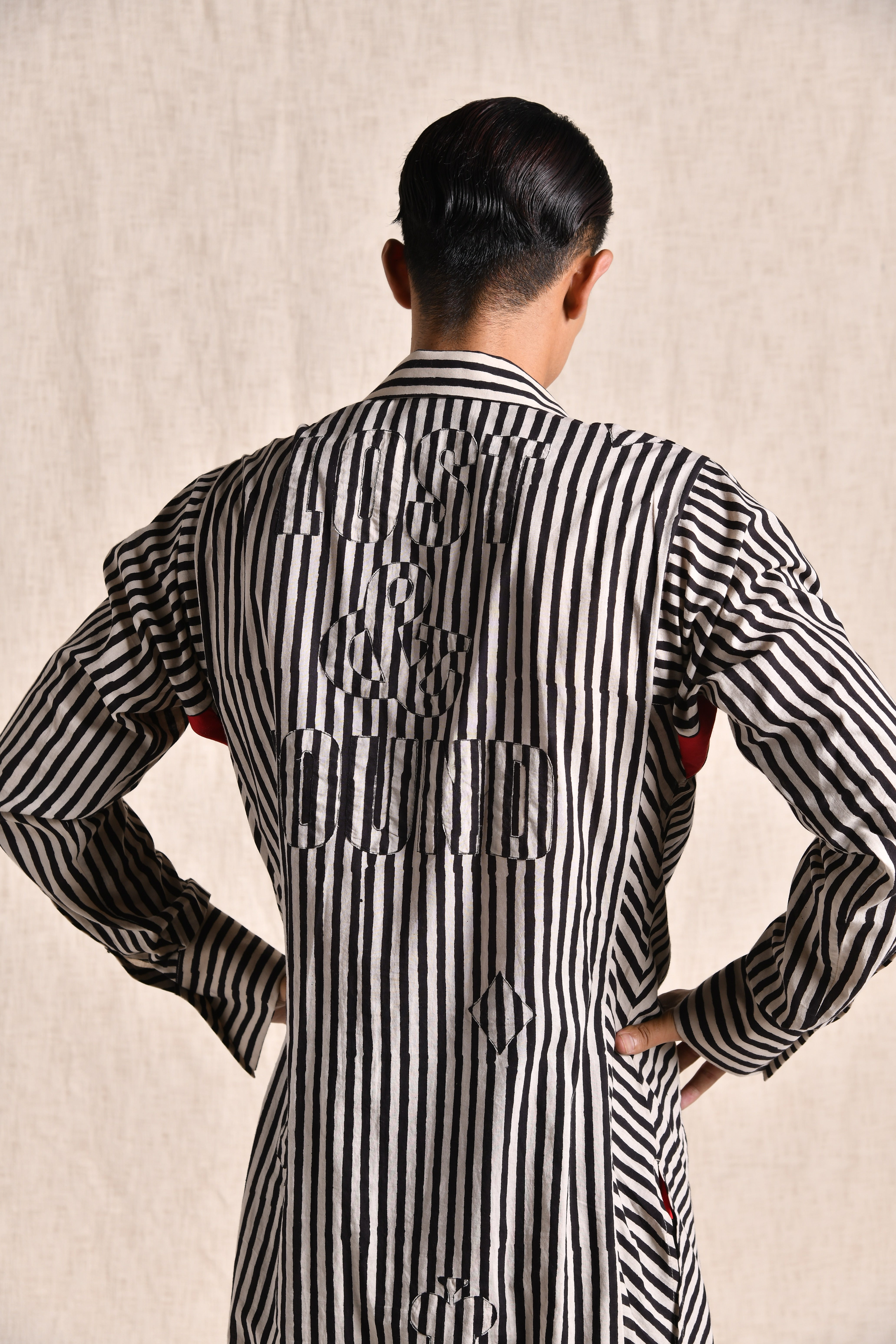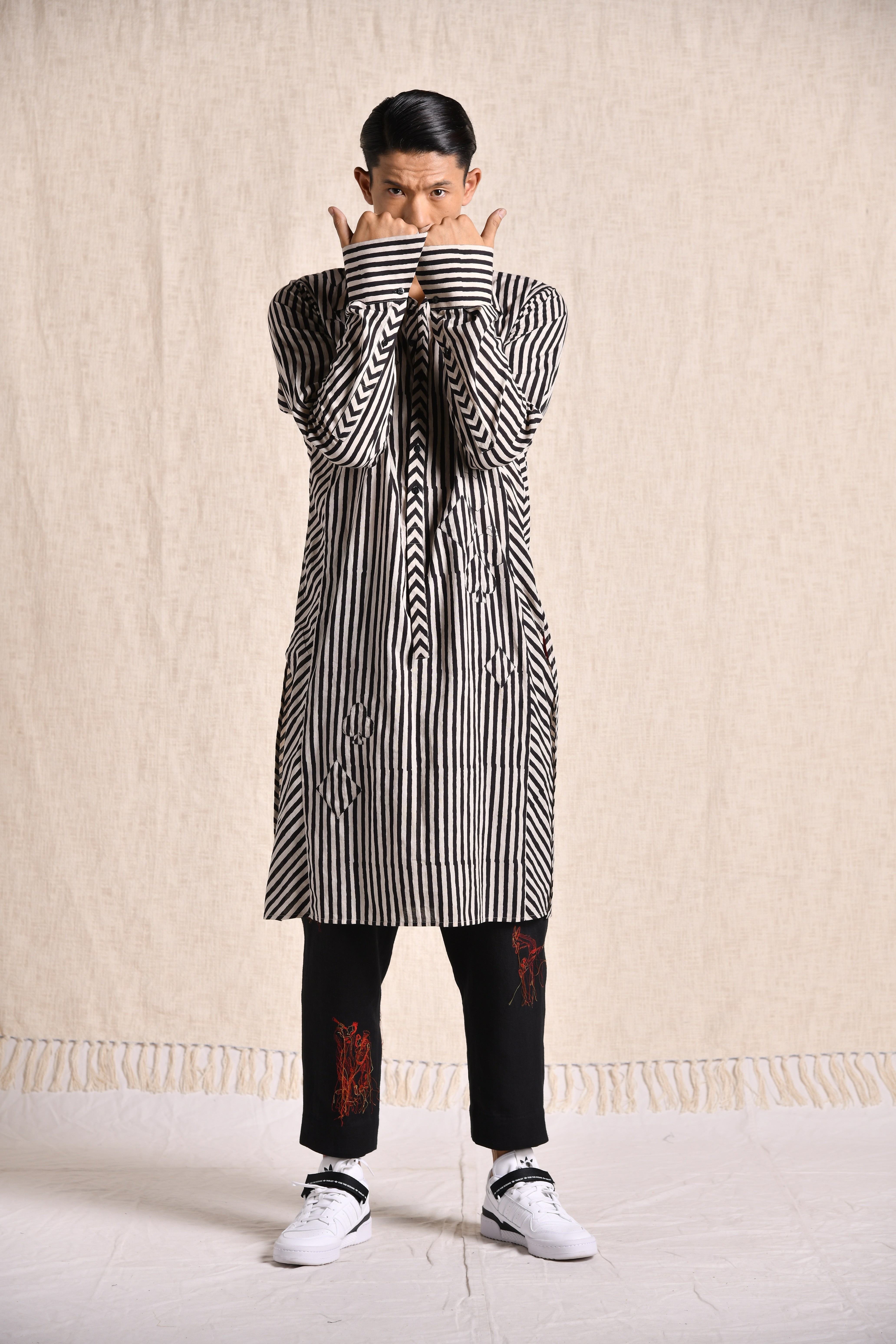Our lost and found longline shirt is a product of line play, wit and optical illusion, straight out of the magician's hat at Khanijo's Circ du Soul. The shirt is inspired by the playing card and illusion play, converted into applique embroidery. Find LOST & FOUND and loose it again to the play of stripes and illusion. Pair it with broad bottom pants or joggers to finish the look.