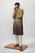 Our olive ombre pin tuck kurta is handcrafted from cotton silk that has been ombre dyed in colours reminiscent of the earth. It also features floating flowers that have been beautifully embroidered in sun-inspired tones. The kurta is finished with a sleak band neck and a concealed placket. If your choice is a fun, traditional haldi, mehendi, sangan, or sangeet, complete the look with a pair of churidaars or salwars and kolhapuris or sandals. Alternatively, play it cool and smart with a pair of pants and slip-on shoes and wear it to a sundowner or an evening event.