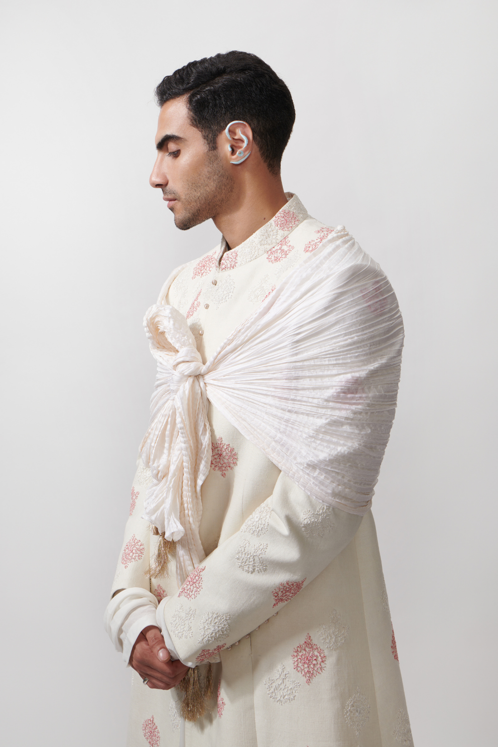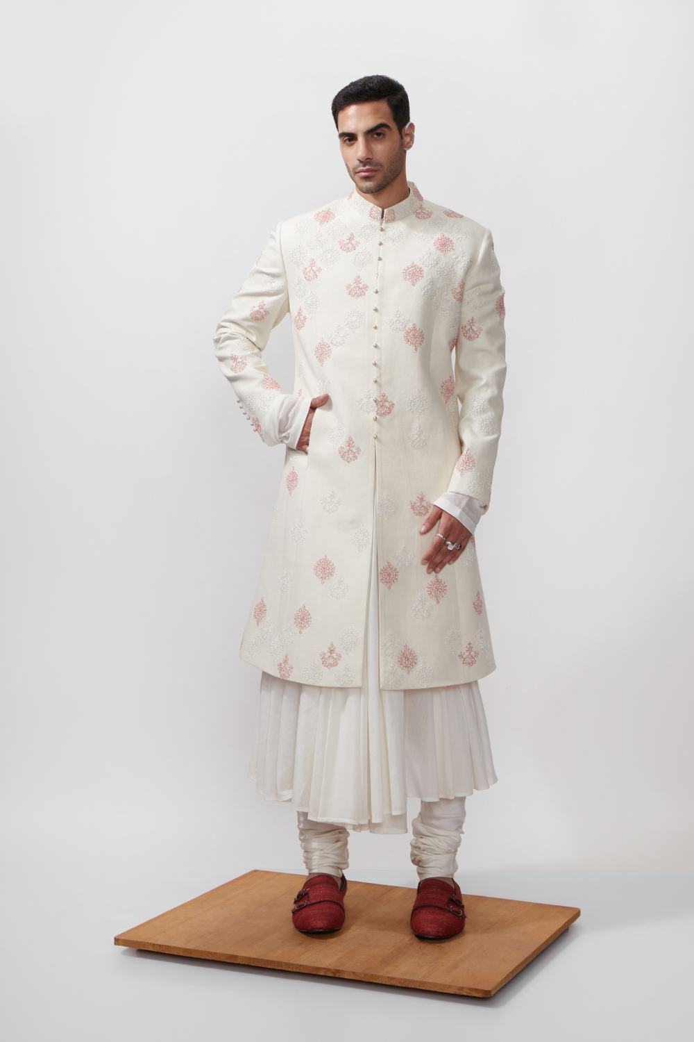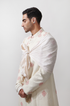 Our Parizaad flared achkan is quintessential groomswear is understated luxury crafted in handloom silk and surfaced with meticulously hand embroidered french knots in tonal and contrasting silk yarns all over. The achkan is cut with a subtle flare borrowed from the traditional jaama and is finished with handmade potli buttons and a beautiful satin lining. Our Parizaad achkan comes with a straight cut kurta crafted in cotton silk, while you may also opt for an angrakha and an embroidered silk shawl to add a more regal character to your outfit. Finish the look with a churidaar and Jootis or go sharp with a customised straight cut with a sharp pair of trousers, Parizaad talks a language that is elegant, subtle and versatile. Request an appointment with our design team for customisations.