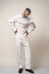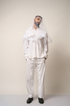A quiet statement in white, this look reimagines classic tailoring through a lens of softness and ease. The pleated co-ord offers structure without rigidity, gently flowing into relaxed pleated trousers that move with grace. Thoughtfully crafted, the ensemble invites reflection on comfort, identity, and presence—where elegance doesn’t demand excess, only honesty in form and feeling.