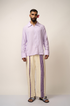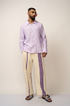 A quiet statement in lavendar, this look reimagines classic tailoring through a lens of softness and ease. The pleated shirt offers structure without rigidity. Thoughtfully crafted, the ensemble invites reflection on comfort, identity, and presence—where elegance doesn’t demand excess, only honesty in form and feeling.