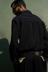 Black pleated shirt made from viscose silk with intricate pleated technique.