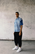 Tiger shirt is handcrafted in fine khadi featuring tiger stripes in ivory and blue appliqued together forming an oversized throw on shirt. The shirt comes with a shirt collar and a half placket making it easy to get in. It’s a piece of wearable art, perfect for summer.