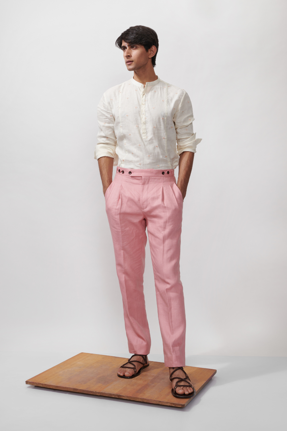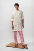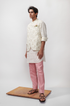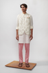 This refined bandi set features an ivory jacket with intricate floral zari embroidery, offering a subtle yet elegant sheen. Paired with a blush pink kurta and matching trousers, the look blends classic charm with modern ease—perfect for daytime celebrations and festive occasions.