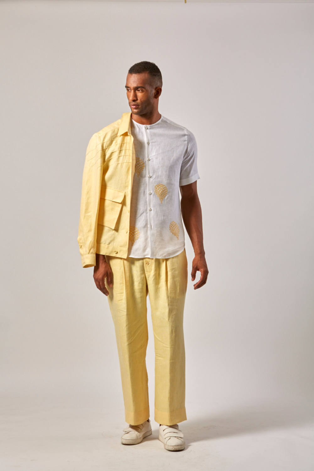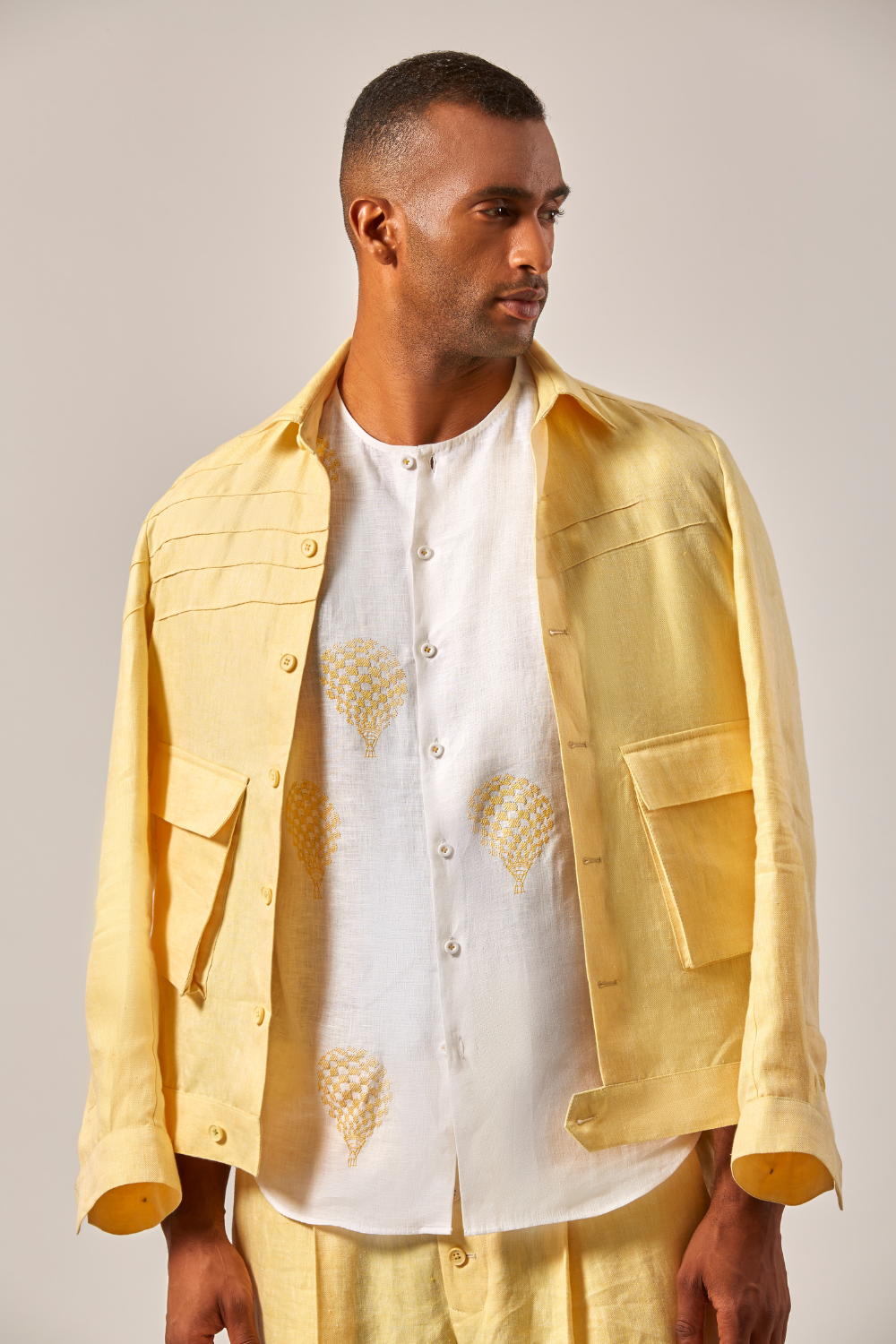 The Balloon Shirt is an easy-layering essential in crisp White linen, short sleeves, and a playful hand embroidered yellow balloon motifs that adds a whimsical touch to the organic fabric. This breathable piece is ideal for a casual daytime outing or relaxed weekend wea