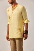 This long-sleeved Yellow Linen Tunic features an open-collar henley style and is elevated by playful balloon motifs intricately hand embroidered onto the chest and functional side pockets. It’s a comfortable, artistic piece for casual evening wear, a cultural event, or a relaxed weekend gathering