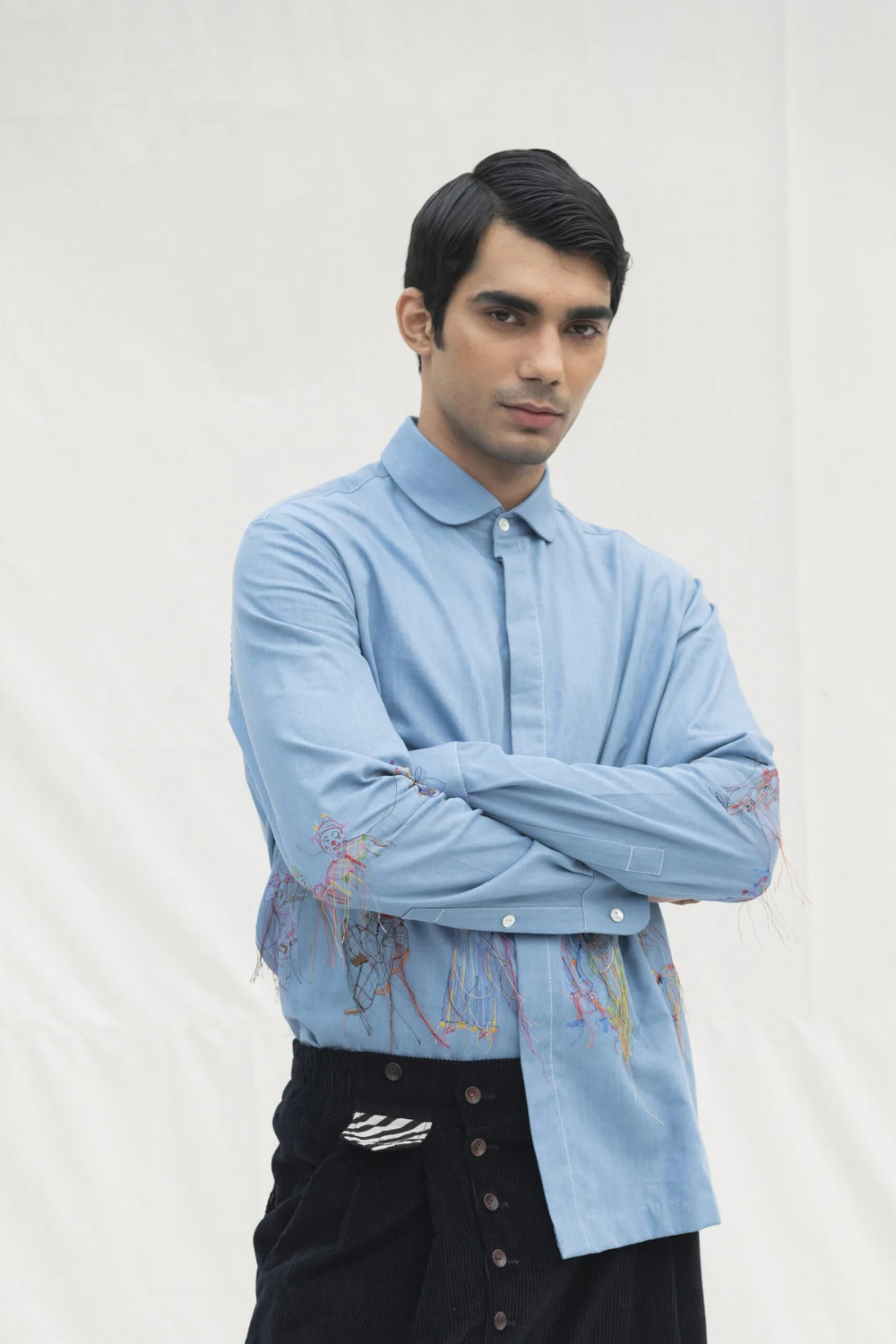Our bally broads shirt is handcrafted in fine feather light cotton denim and display beautifully embroidered character from Khanijo’s circus – Circ Du Soul. The shirt comes with a concealed placket and a fine cotton lining. The shirt is finished with ethically sourced mother of pearn buttons. Match this shirt with your denims, joggers or chinos to a day affair or take the circus clubbing with you – this one has got your covered every way!