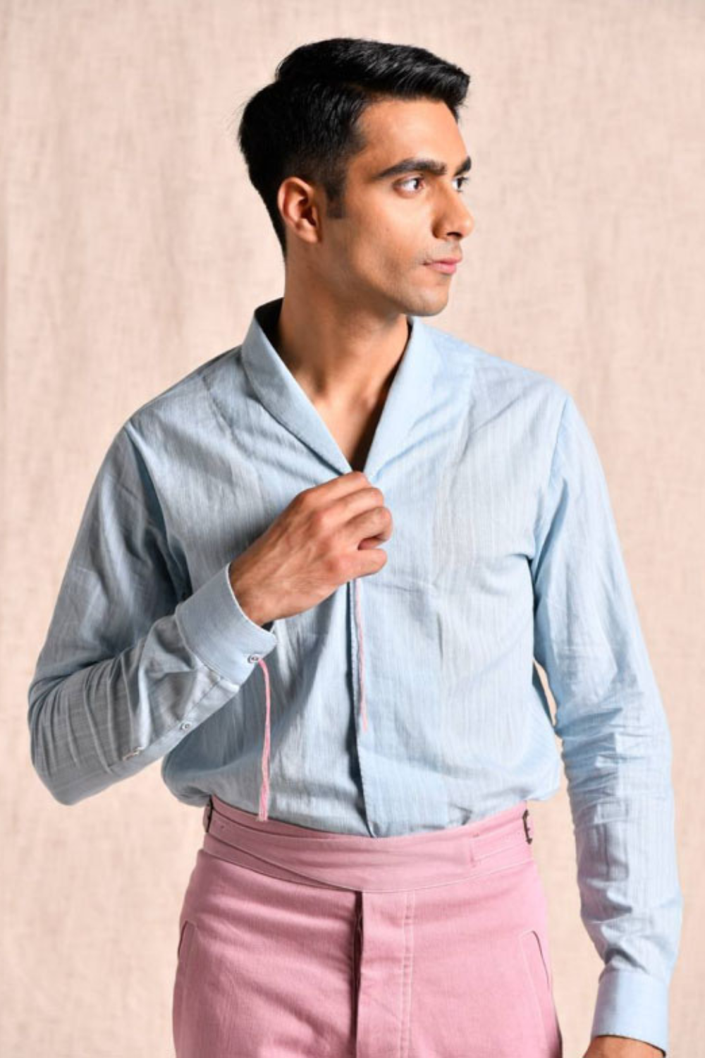 Our cloud shirt is handcrafted in fine, naturally dyed khaadi and we can vouch for the comfort it comes with for the wearer. The shirt features a small shawl collar, making it a perfect holiday shirt.