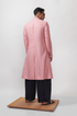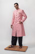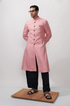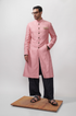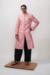 This elegant achkan, tailored from breathable linen in a refined salmon pink hue, presents a perfect fusion of traditional silhouette and modern sensibility. Featuring a structured bandhgala collar and a straight-cut profile, the garment is accentuated with metallic-toned buttons that run seamlessly down the front.