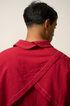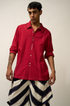 This shirt is a relaxed, artisanal piece crafted from textured red cotton, featuring intricate hand-embroidered kantha stitch detailing. Designed with a loose silhouette, it includes a spread collar, three-quarter sleeves, and a front button closure, balancing structure with ease. The minimal tailoring is elevated by the tactile lines of white thread, giving it a contemporary, handcrafted edge that bridges heritage with modern casual wear.