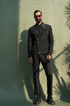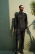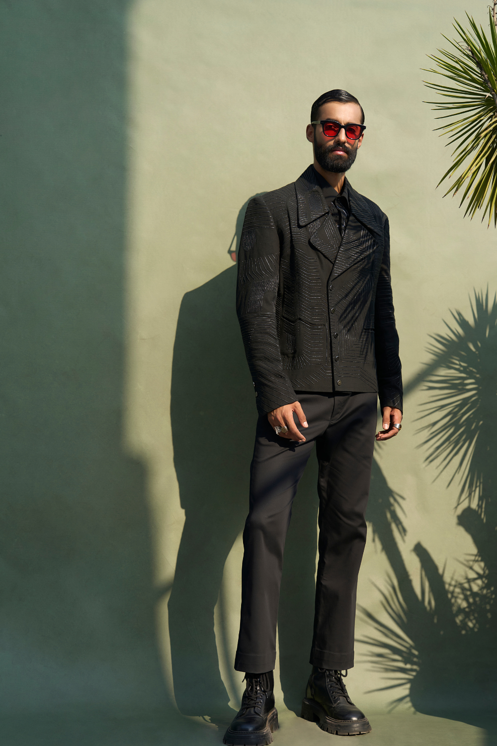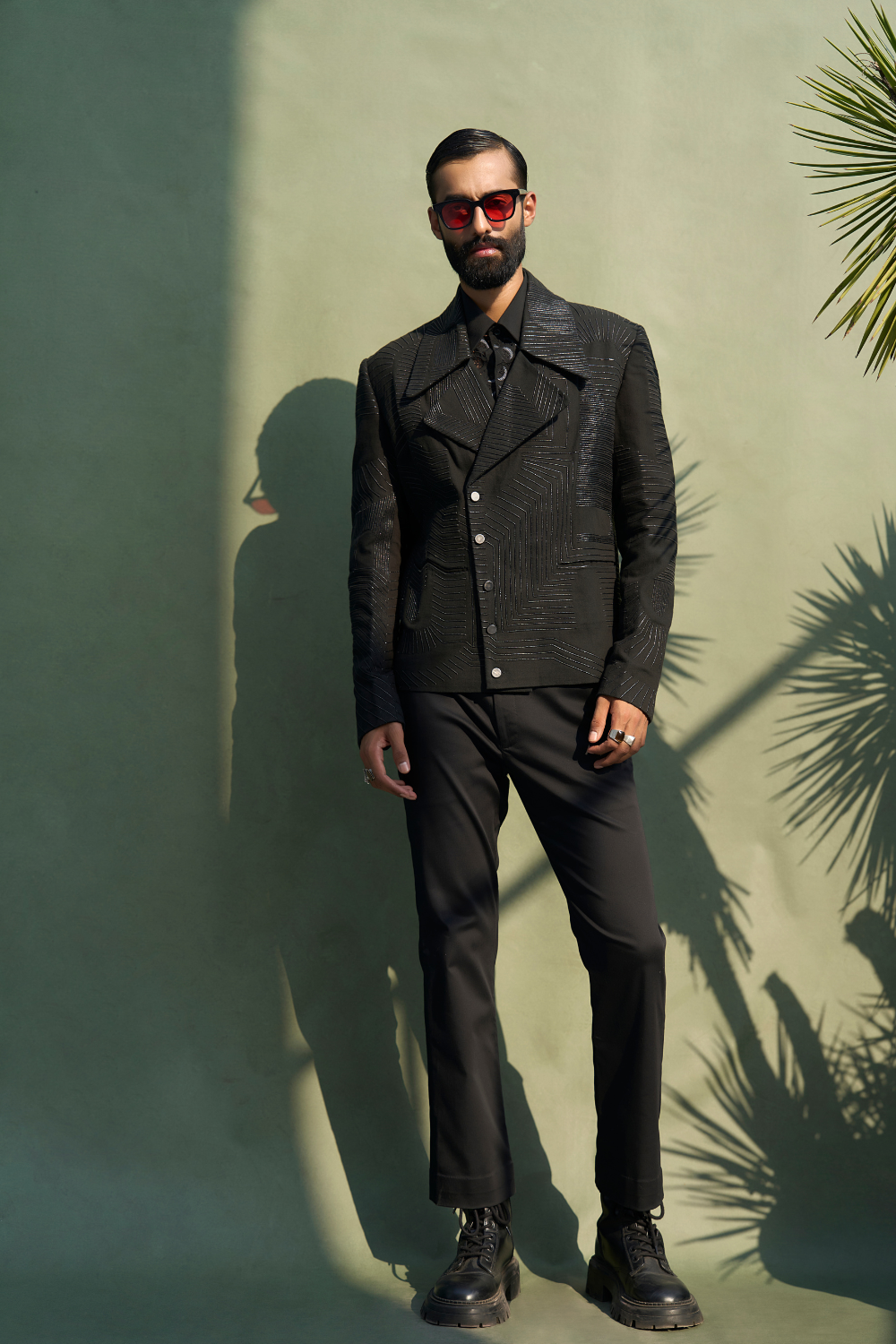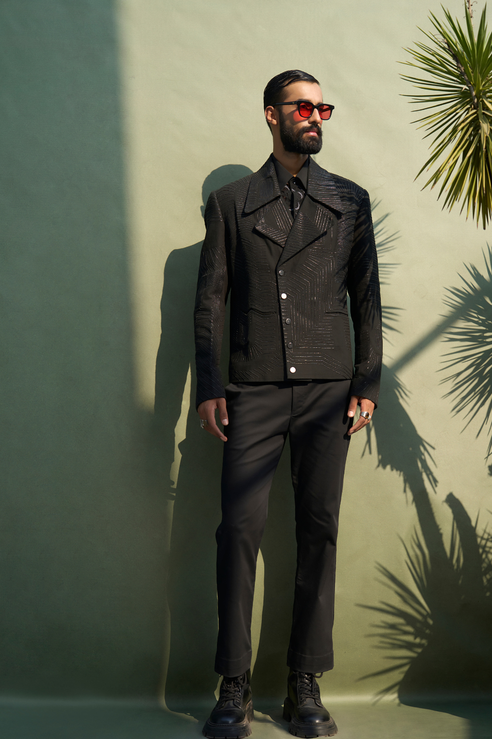 The Relativity jacket in black features black embroidery that creates a striking illusion of depth, adding dimensional perspective and architectural intrigue to the silhouette. This piece is a blend of comfort and style, making it ideal for both formal and semi-formal settings.