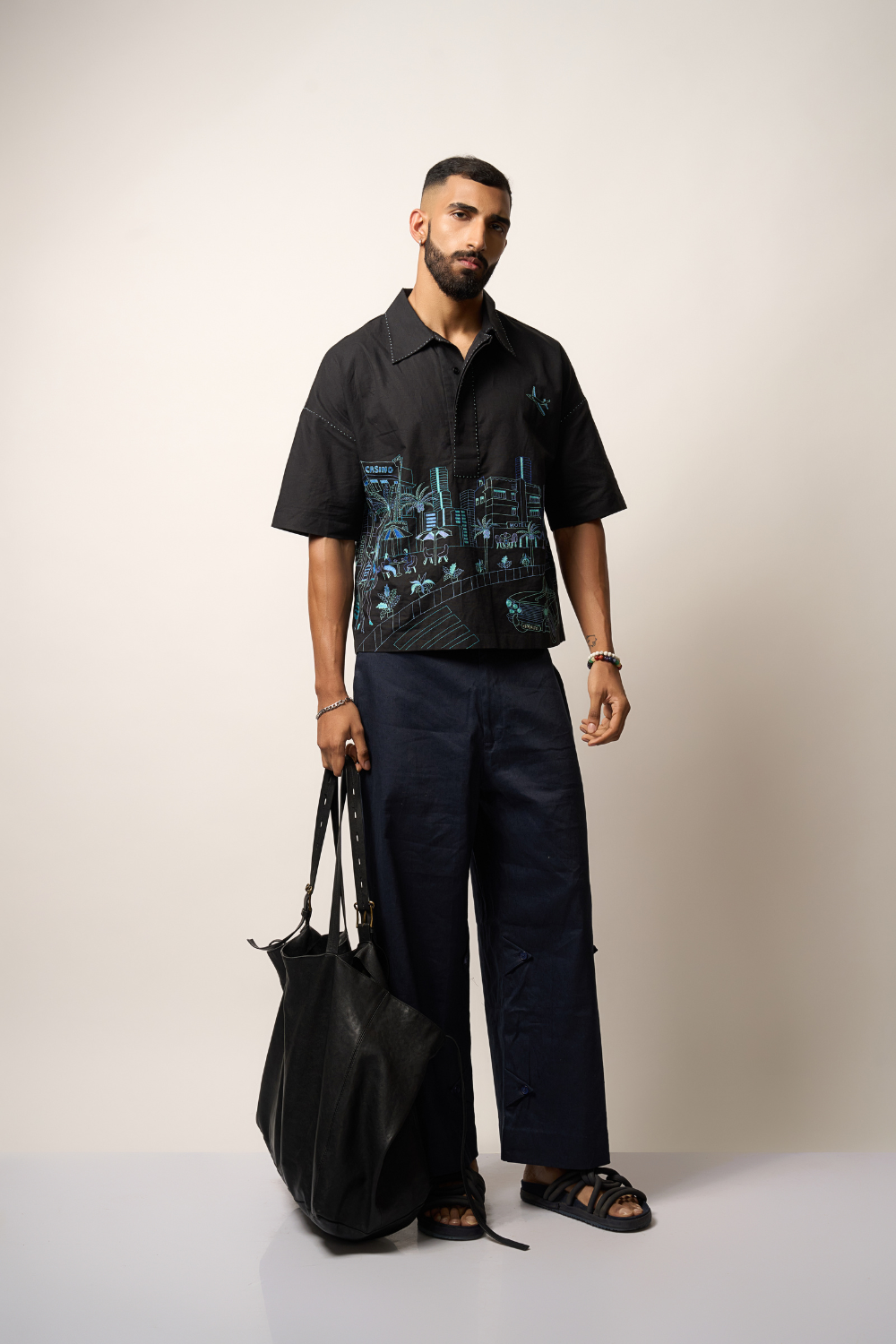The Miami Shirt features a vibrant embroidered cityscape in a playful palette, capturing the charm of neon-soaked streets and retro flair. Style it with dark linen trousers and beaded accessories for an effortless resort edge.