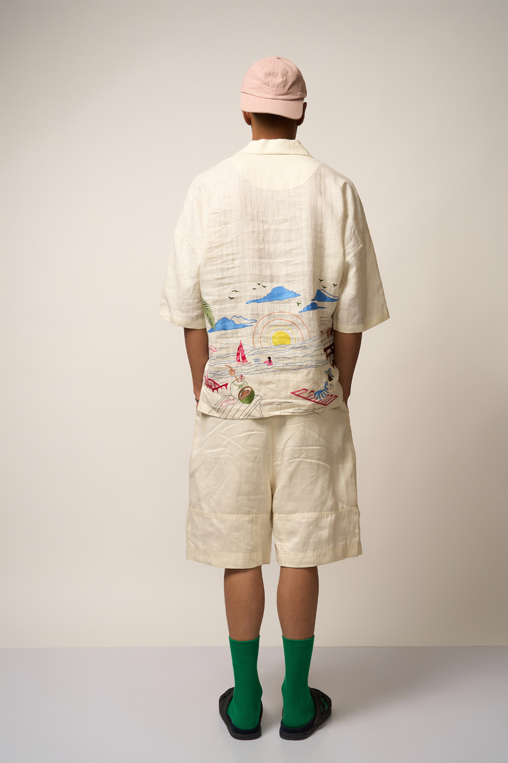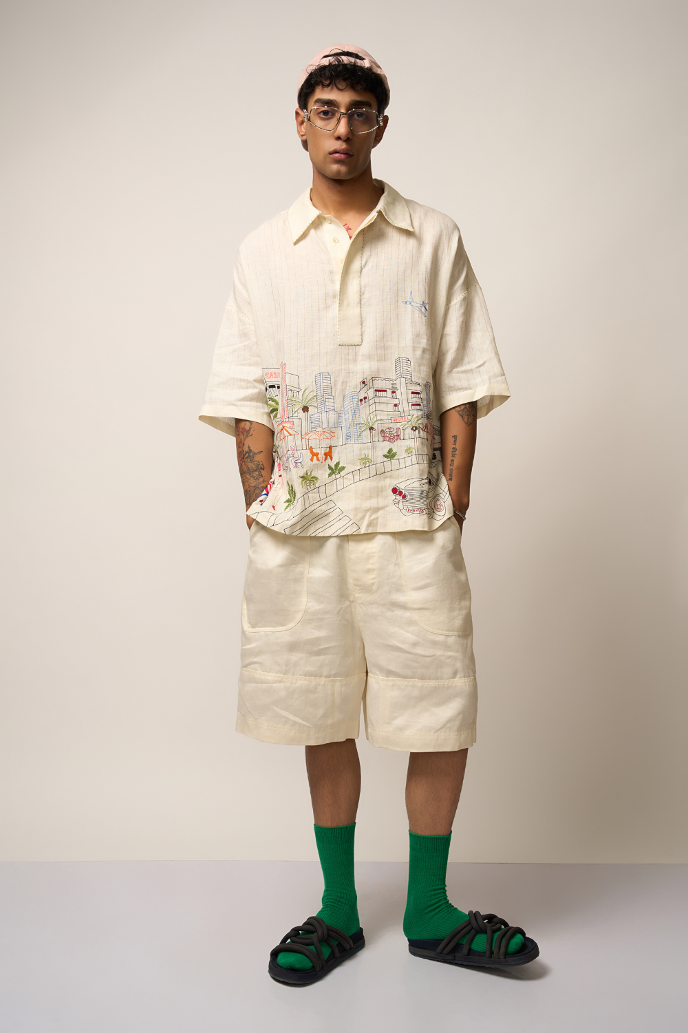 The Ivory Miami Shirt features a vibrant embroidered cityscape in a playful palette, capturing the charm of neon-soaked streets and retro flair. Style it with light linen trousers and beaded accessories for an effortless resort edge.