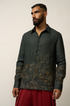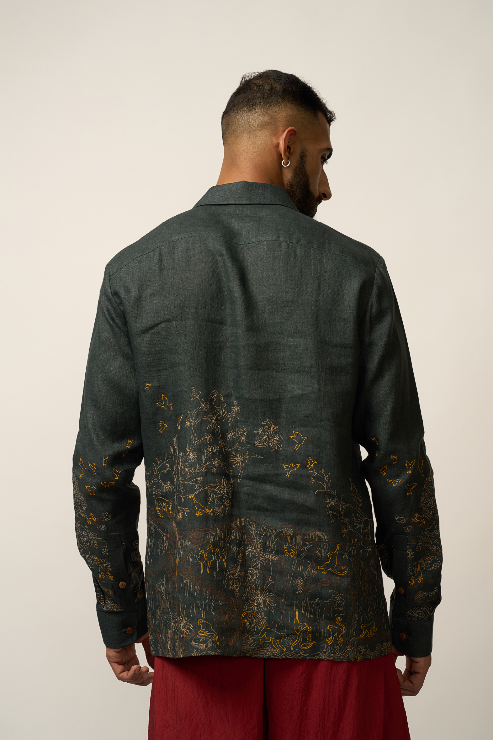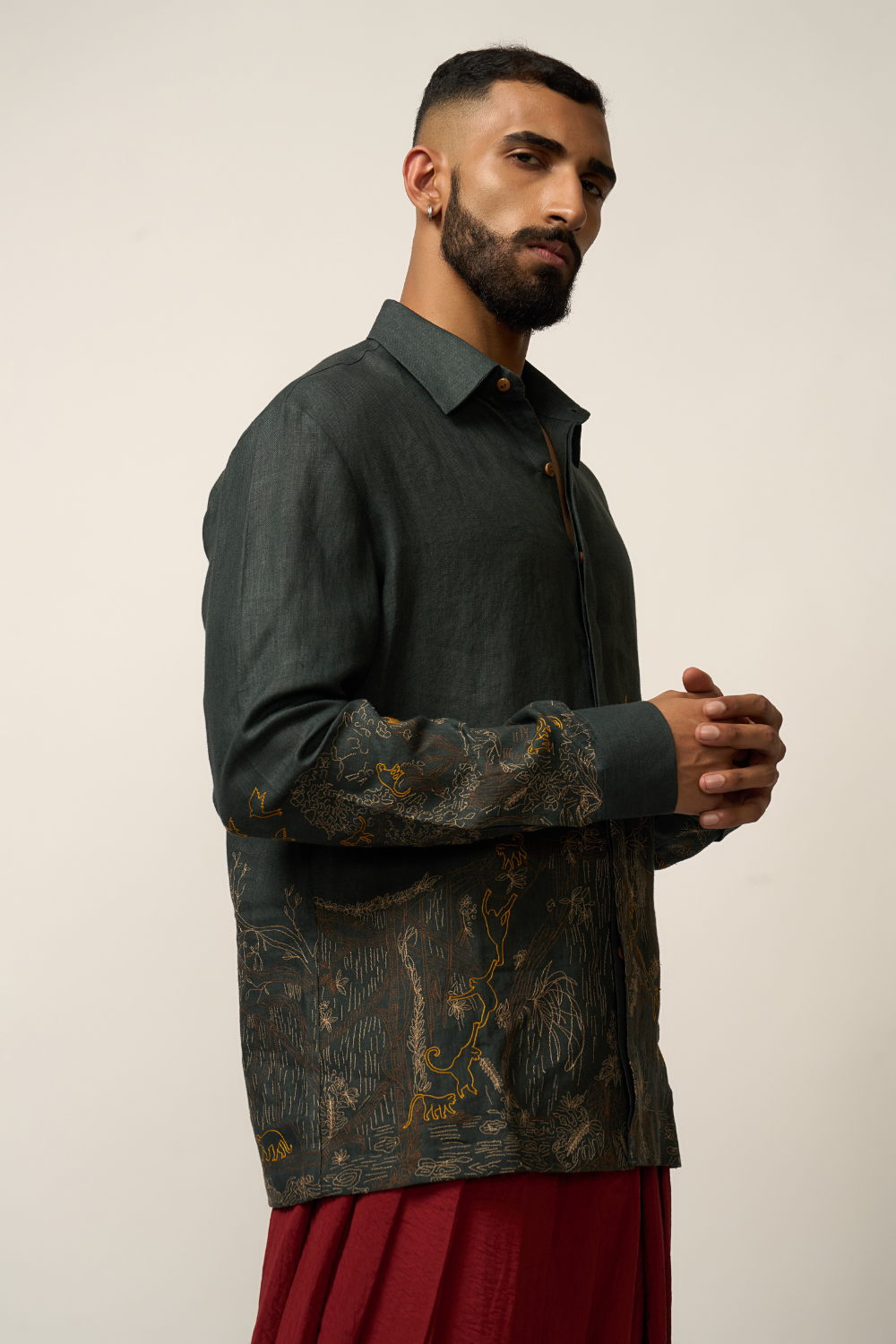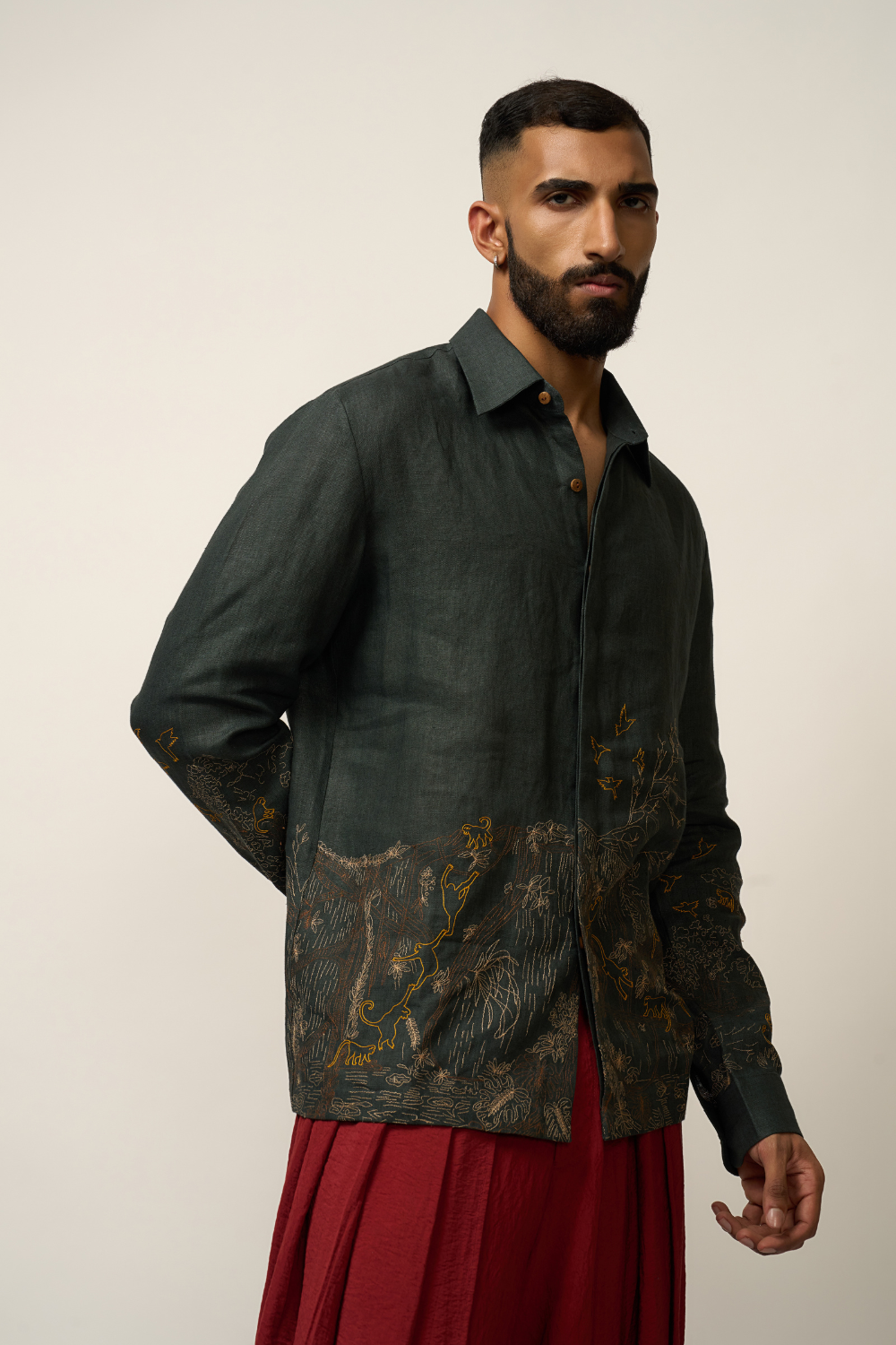 Made in finest count khaadi, this ink green shirt is cut into a phenomenal comfort fit. Perfect for your special occasions this statement shirt illustrating monkeys in their natural habitat is done using fine embroidery techniques and finished with a fine cotton lining.