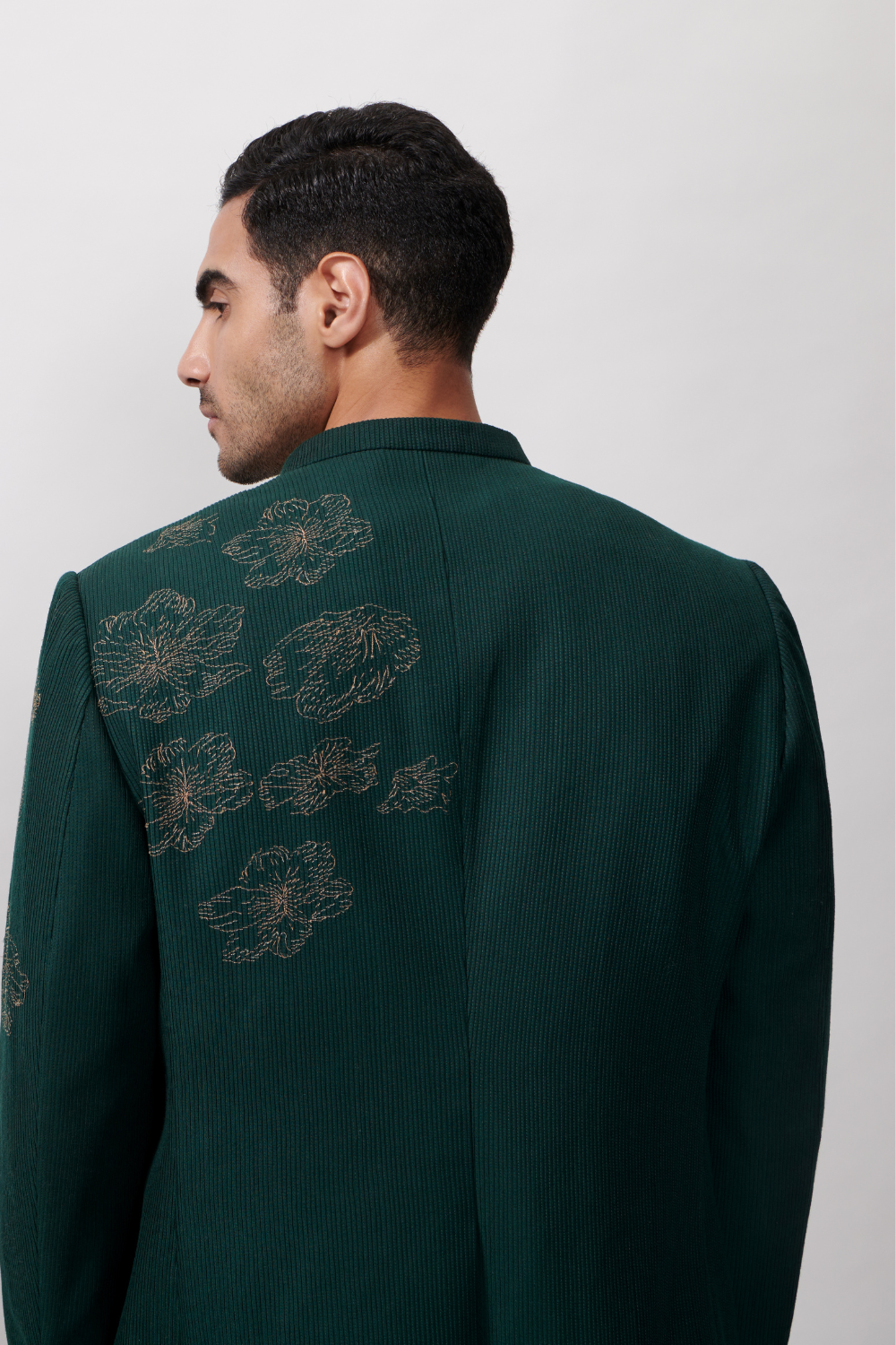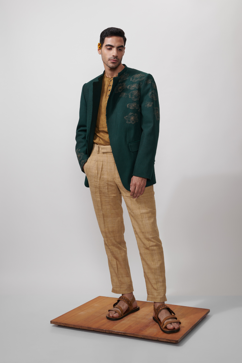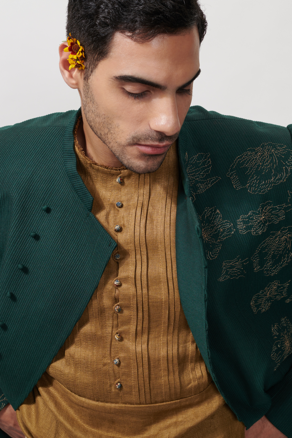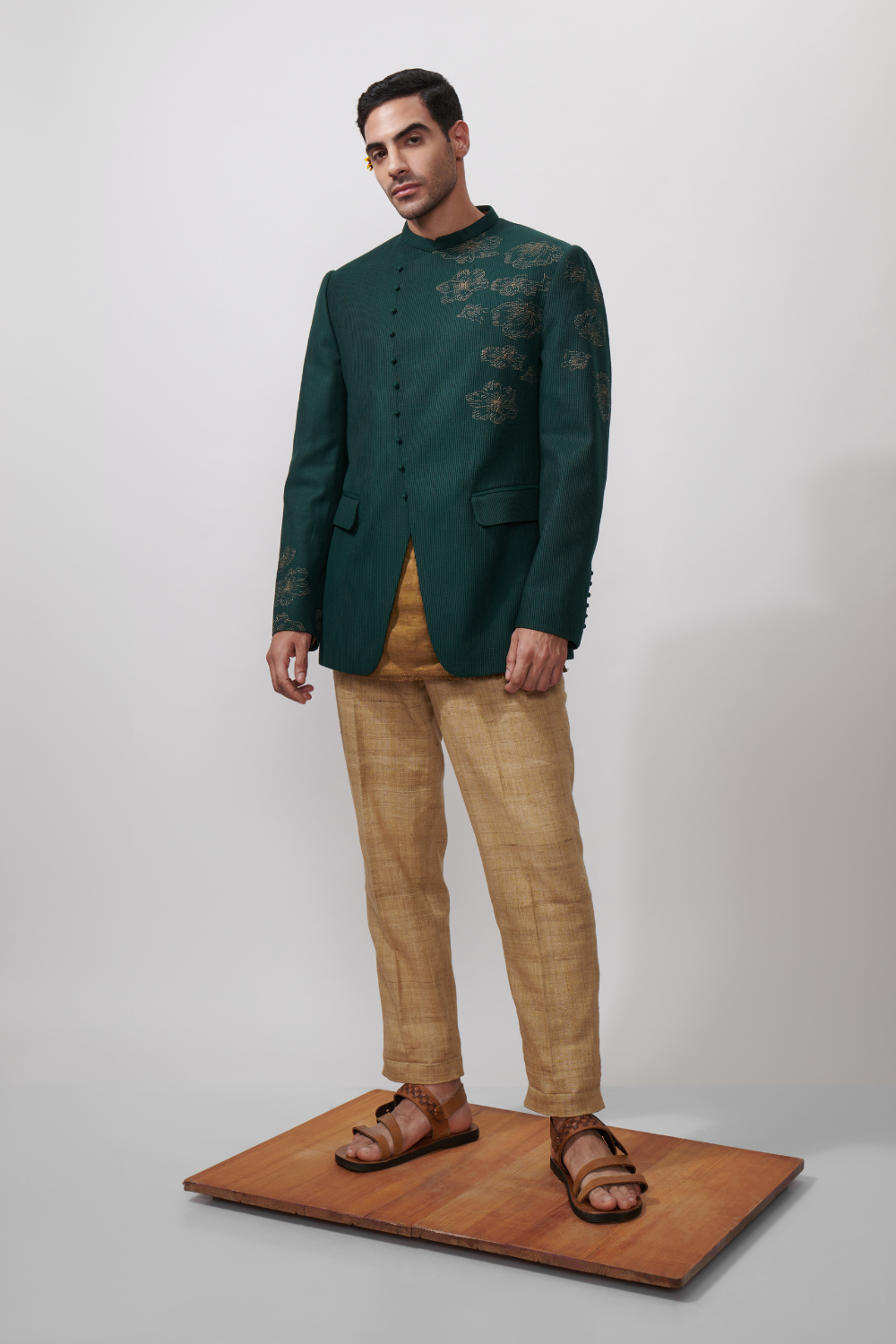 Our embroidered pin tuck bandhgala is richly textured with little pintucks and overlaying silk yarn-embroidered flowers. To make the closures easier, the bandhgala's asymmetric placket incorporates hand-made potli buttons. The bandhgala is exquisitely crafted inside a satin lining. Pair this bandhgala with a neutral pair of trousers or salwars and you are good to go.