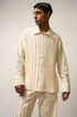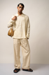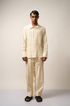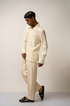 A quiet statement in ivory, this look reimagines classic tailoring through a lens of softness and ease. The pleated shirt offers structure without rigidity, gently flowing into relaxed pleated trousers that move with grace. Thoughtfully crafted, the ensemble invites reflection on comfort, identity, and presence—where elegance doesn’t demand excess, only honesty in form and feeling.