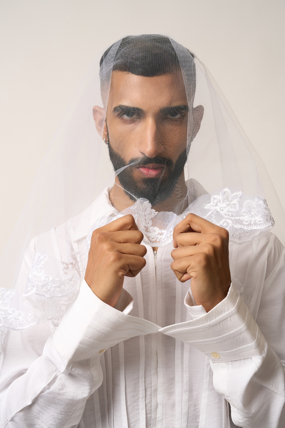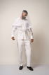 A quiet statement in white, this look reimagines classic tailoring through a lens of softness and ease. The pleated co-ord offers structure without rigidity, gently flowing into relaxed pleated trousers that move with grace. Thoughtfully crafted, the ensemble invites reflection on comfort, identity, and presence—where elegance doesn’t demand excess, only honesty in form and feeling.