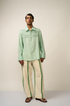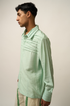 A quiet statement in mint, this look reimagines classic tailoring through a lens of softness and ease. The pleated shirt offers structure without rigidity. Thoughtfully crafted, the ensemble invites reflection on comfort, identity, and presence—where elegance doesn’t demand excess, only honesty in form and feeling.
