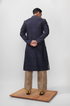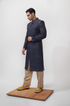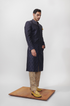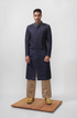 Crafted from luxurious handloom silk, this navy blue achkan is a sophisticated confluence of geometry-inspired design and traditional artistry. The surface is adorned with meticulous kantha stitch embroidery arranged in a diamond grid pattern, reflecting a structured, architectural aesthetic. Adding a layer of elegance, floral zari embroidered motifs embellish the collar and armhole, offering a delicate contrast to the geometric base. Finished with a bandhgala collar, a tailored cut, and a gold-toned brooch at the chest, this achkan is ideal for evening occasions where refined craftsmanship and contemporary form meet seamlessly.