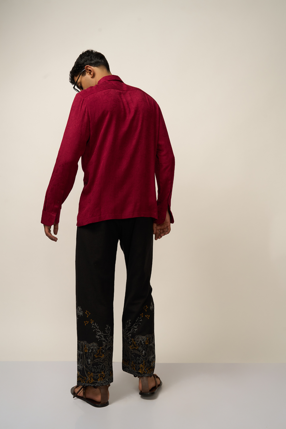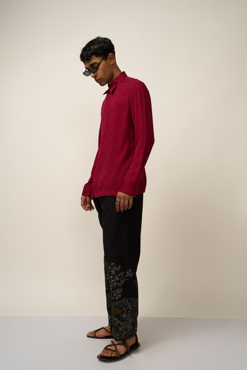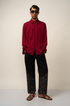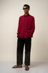 A rich take on understated elegance, this crimson shirt is crafted in a subtly textured jacquard that catches the light without calling for it. The soft sheen elevate its minimal silhouette, while the concealed button placket and relaxed tailoring allow for both ease and refinement. Designed for quiet confidence, it’s a piece that speaks through texture, not volume.