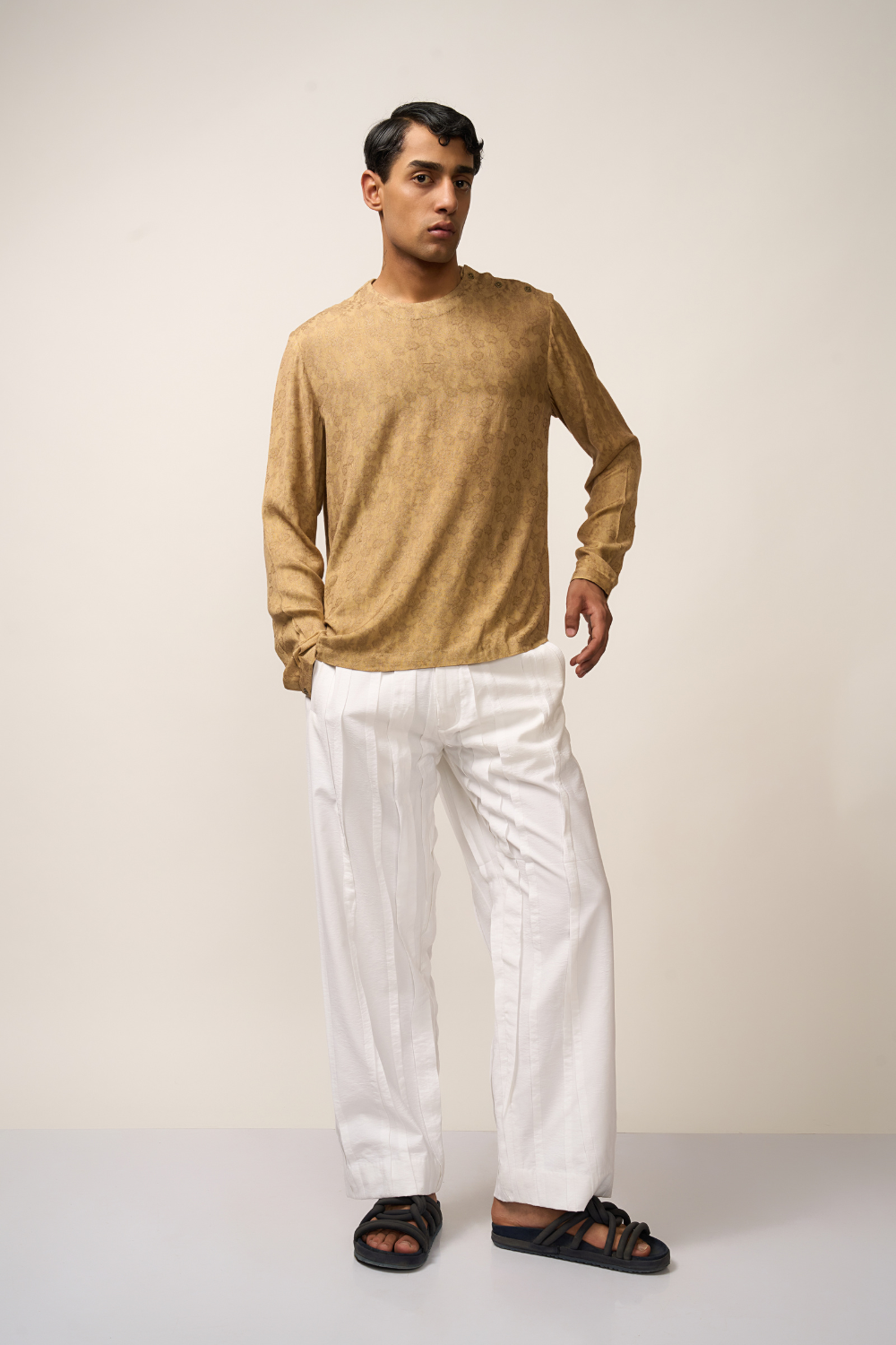 A rich take on understated elegance, this crimson shirt is crafted in a subtly textured jacquard that catches the light without calling for it. The soft sheen elevate its minimal silhouette, while the concealed button placket and relaxed tailoring allow for both ease and refinement. Designed for quiet confidence, it’s a piece that speaks through texture, not volume.