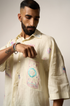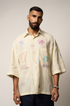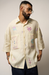 The Tarot shirt in linen is adorned with whimsical embroidered motifs—sun, moon, unicorns, stars, and tarot frames. Its loose, oversized silhouette and dreamy palette make it a playful statement, perfect with wide-leg pants, skirts, beads, or bold sunglasses for a mystical street-style look.